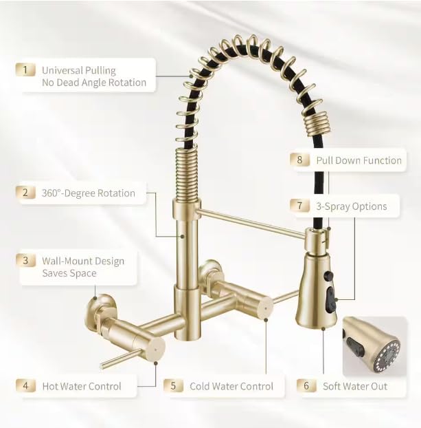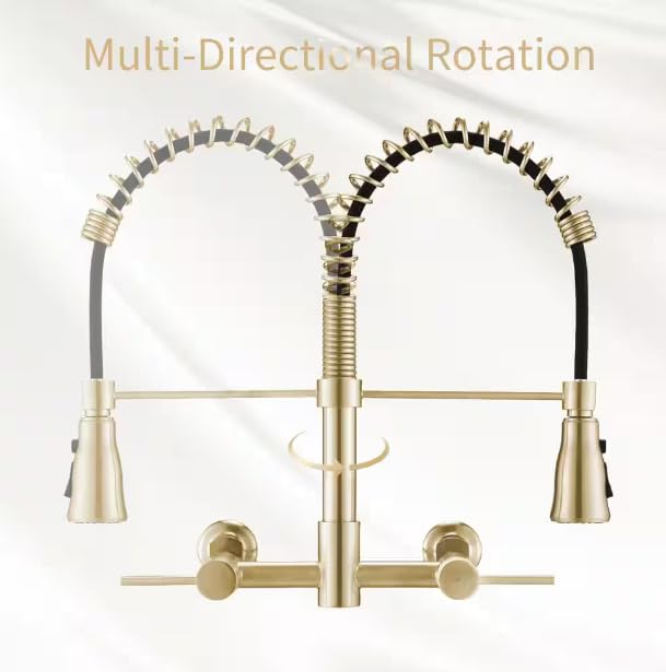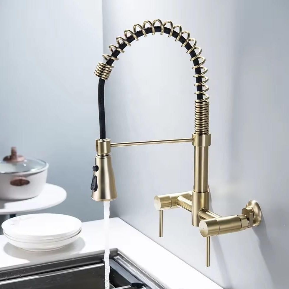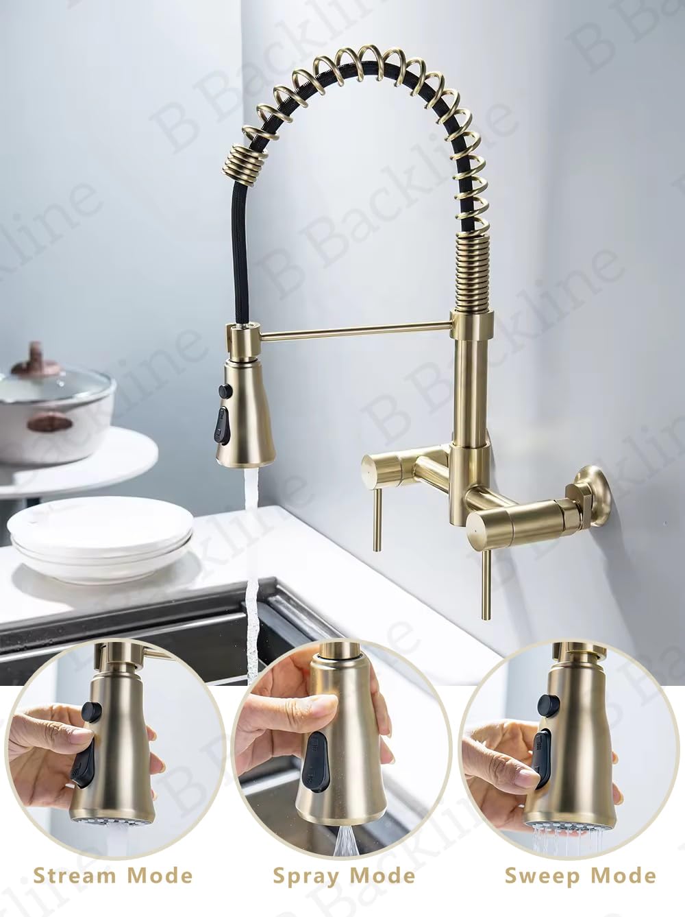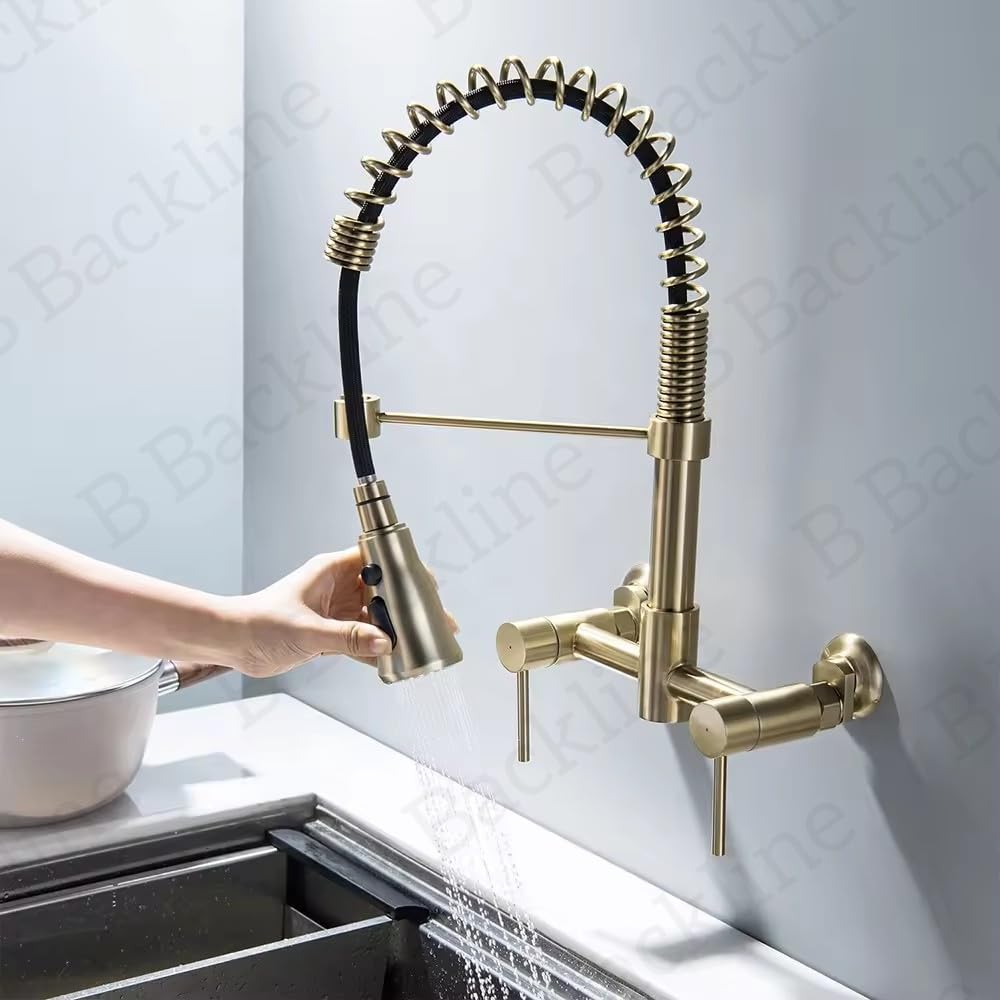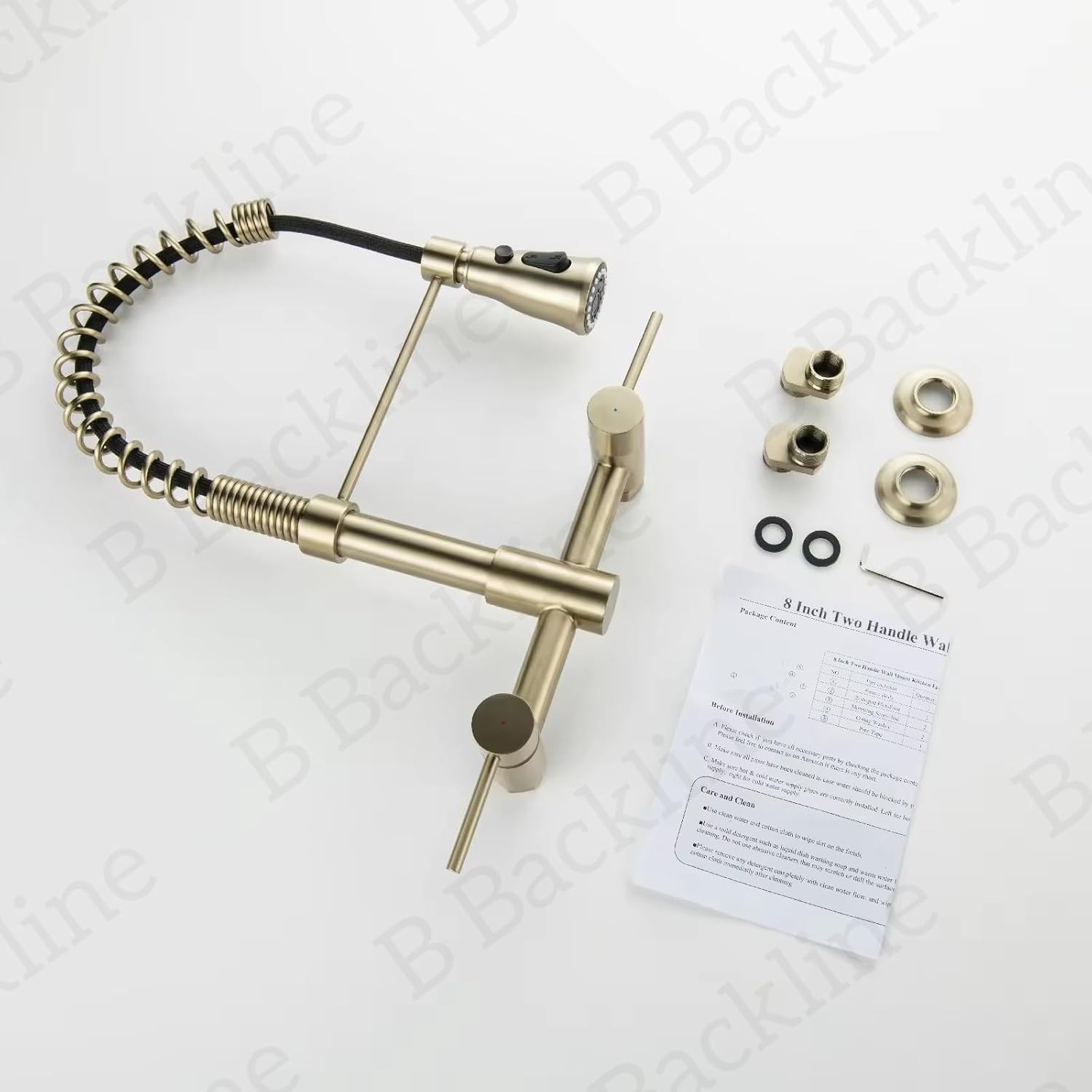 B Backline Brass Wall-Mount Sink Tap Hot & Cold Mixer Pullout Kitchen Faucet (Gold Brushed)