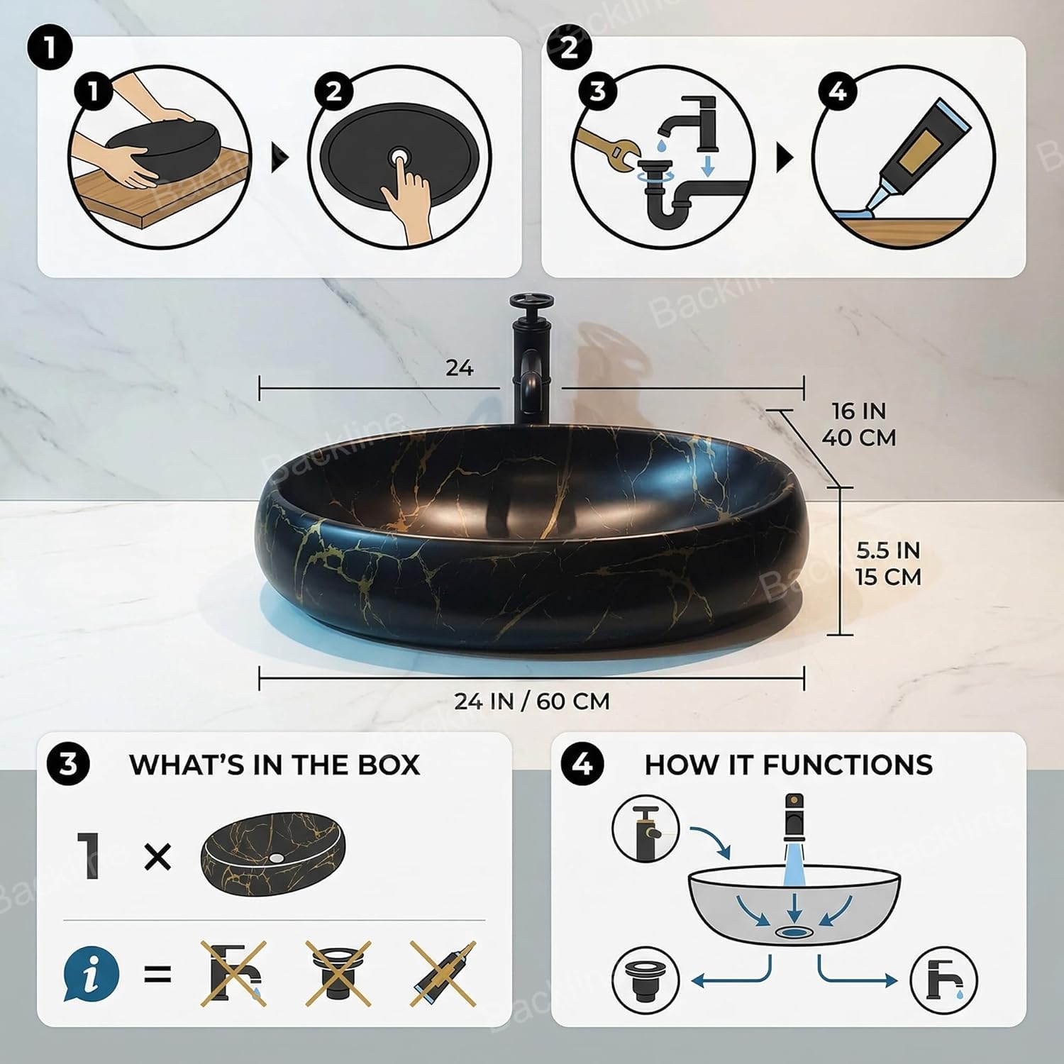 - The Table Top Basin has Easy Installation – Bathroom sink can be installed as Countertop sink, note: fitting bolt and waste and tap are not included.
