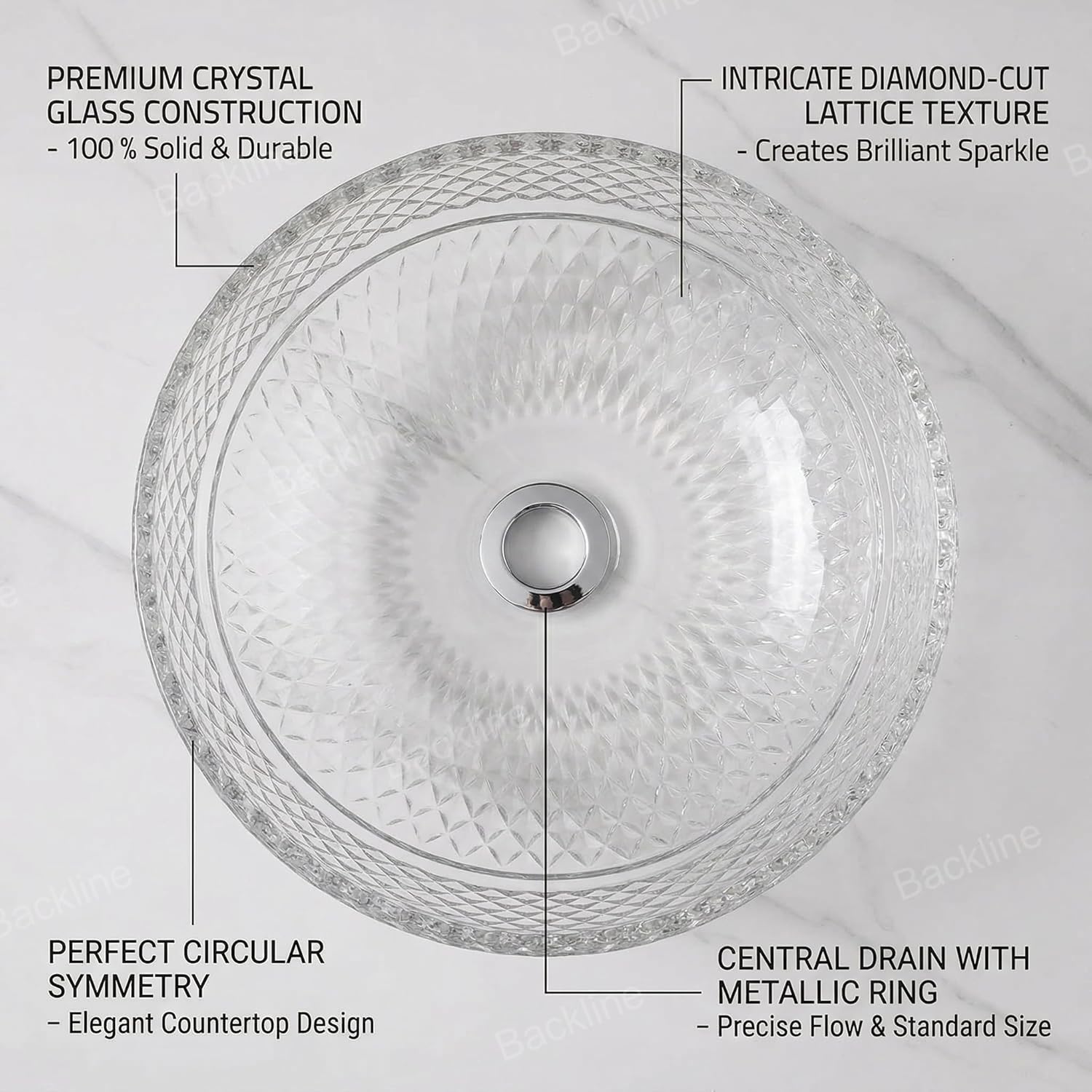 B Backline Luxury Glass Basin | Table Top Wash Basin | Counter Top Basin | Glass Bowl Basin For Bathroom & Livingrooms 42 X 42 X 18 Cm (White Transprent)