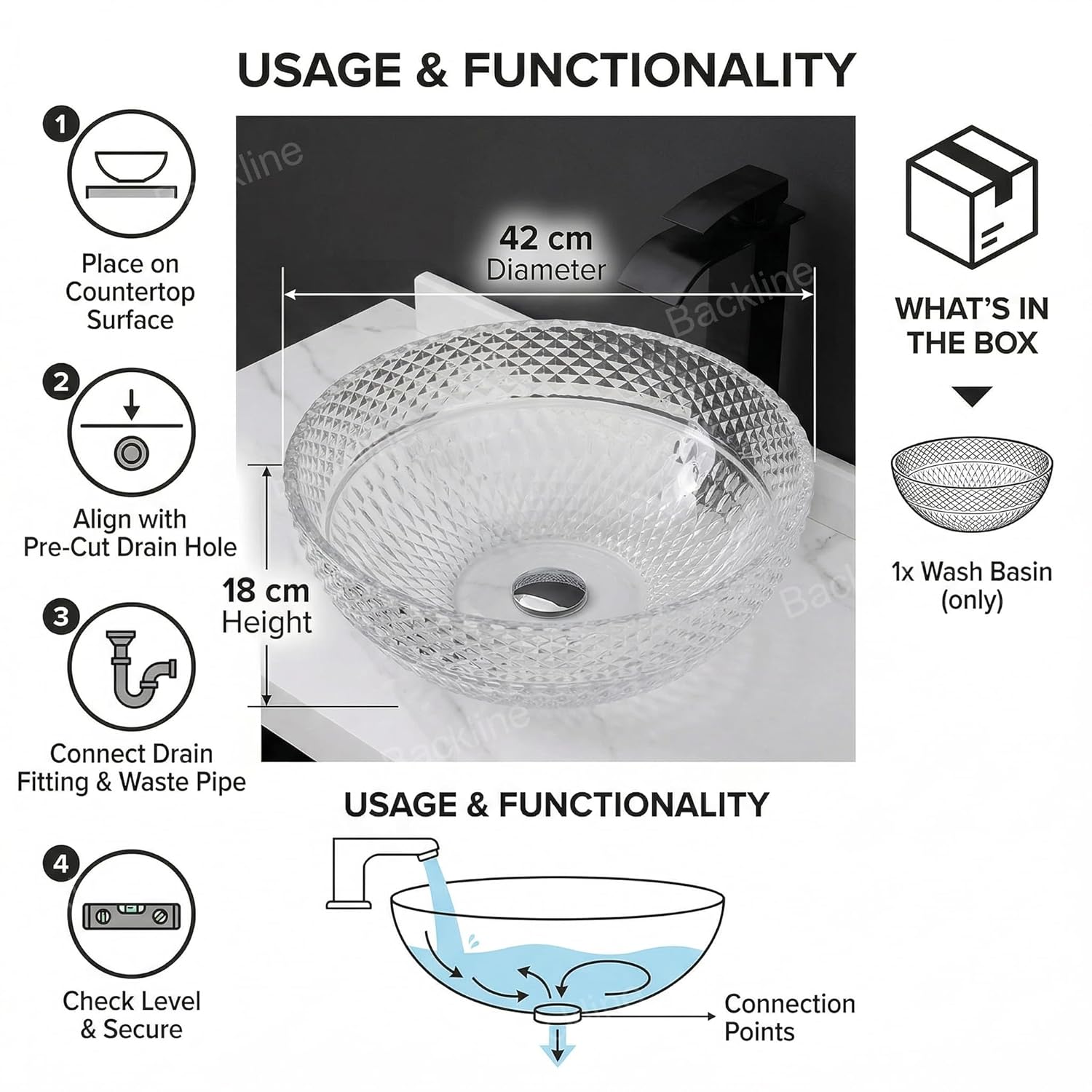 - Easy to Clean. High Temperature Integral Molding, Seamless, No Leakage, Longer Life. Note: Wash with water and shampoo only. Package Included: Basin Only ( Taps, Faucet and other accessory are not included)