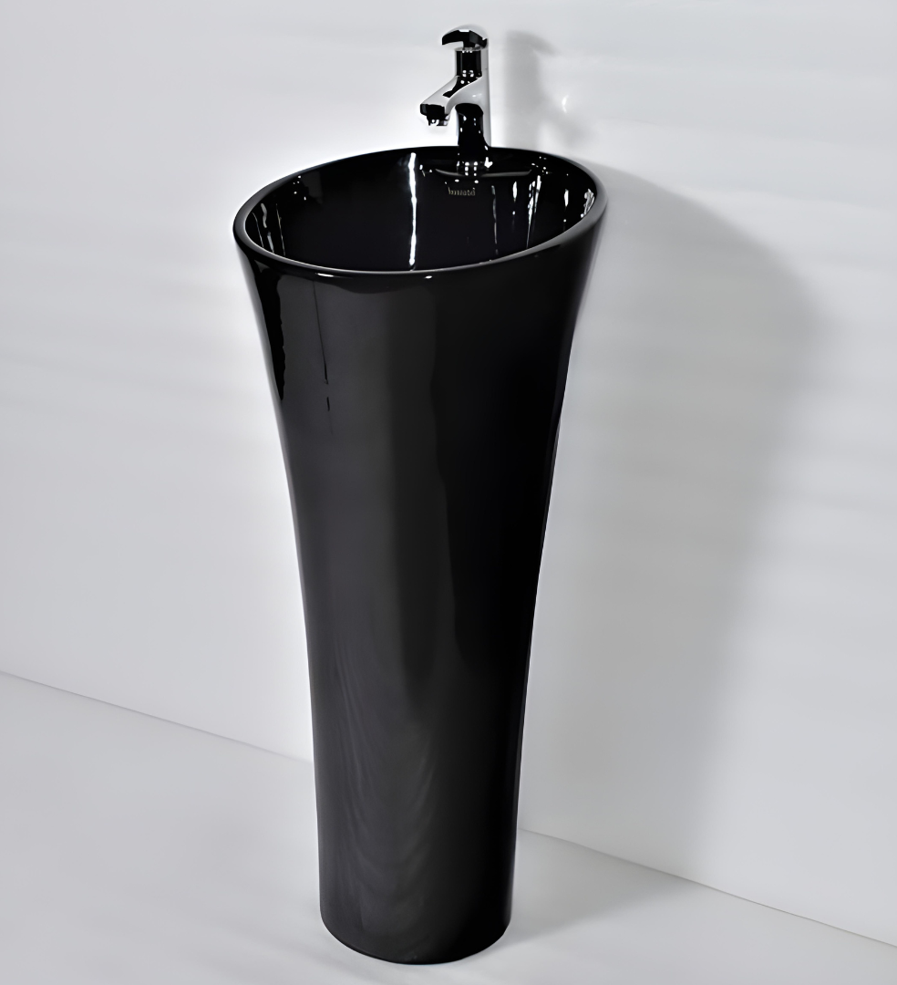 Ceramic Round Pedestal Free Standing Wash Basin In Black Glossy