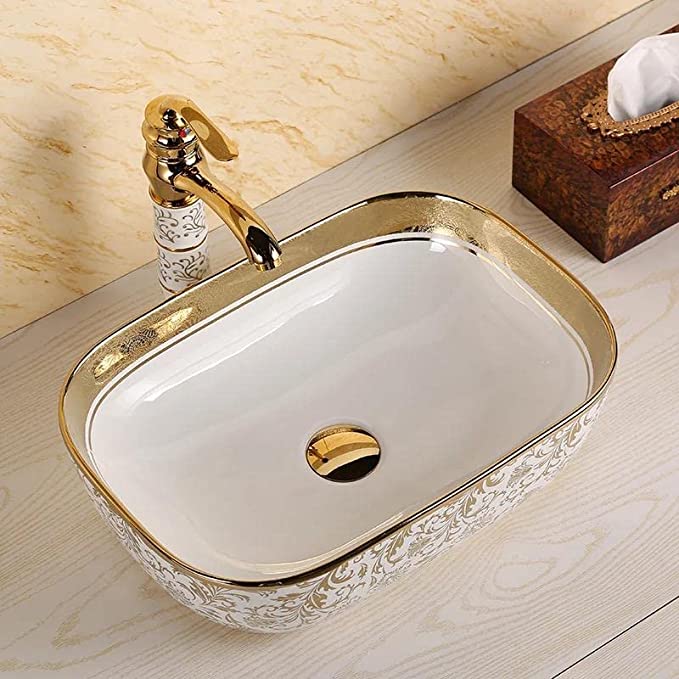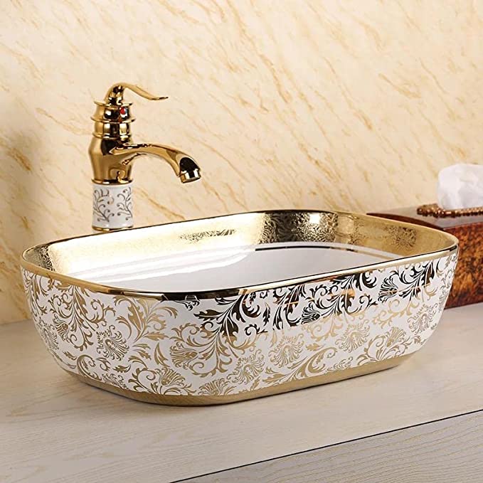 Ceramic Rectangle Shape Counter Top Wash Basin Gold Color