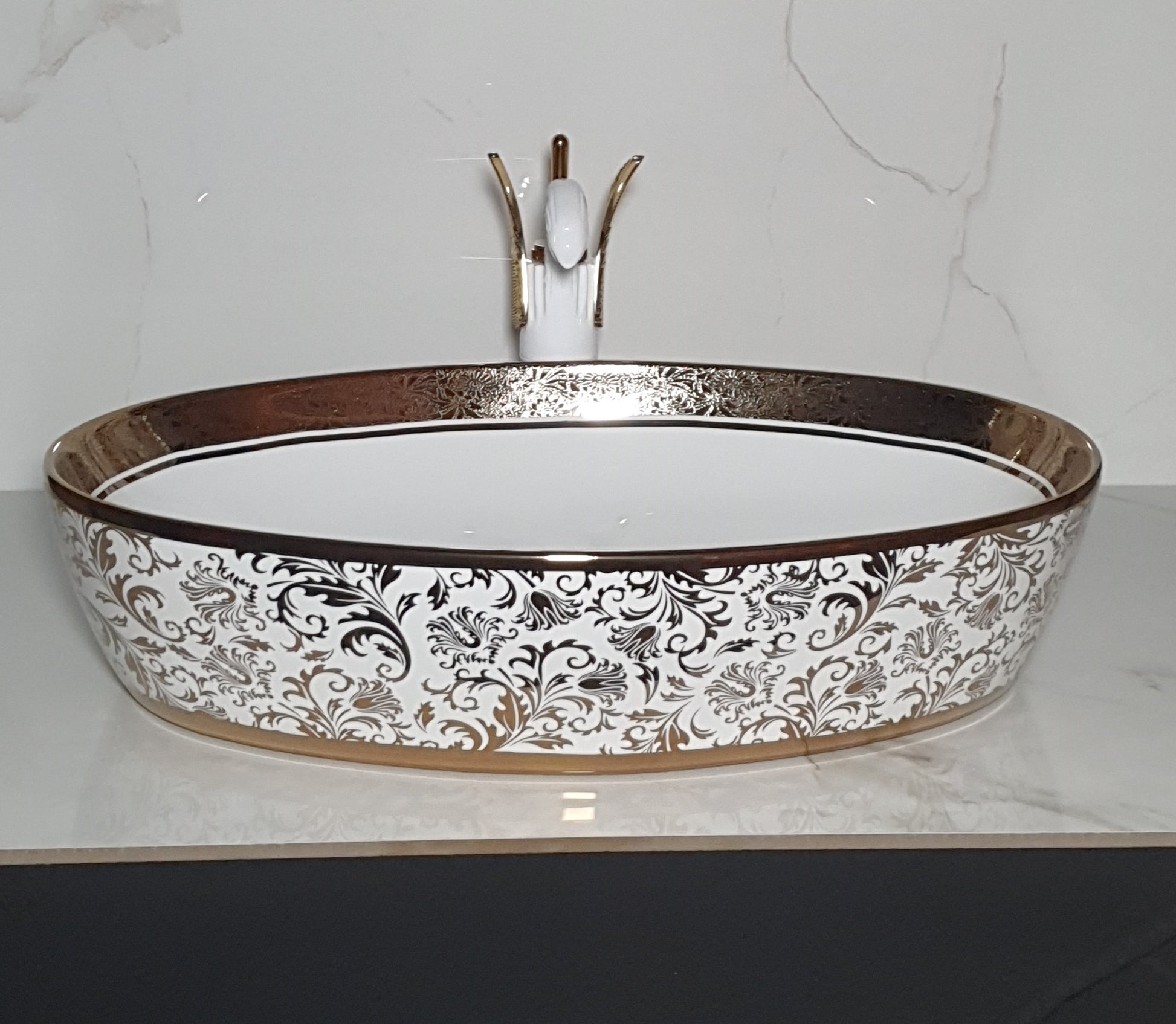 Ceramic Oval Shape Counter Top Wash Basin Gold White Color