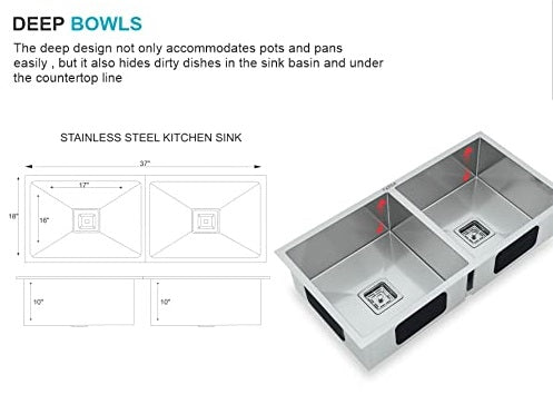- Size of this Sink is 37 x 18 x 9 Inches and Each Bowl Size is 16 x 16 x 8 Inch