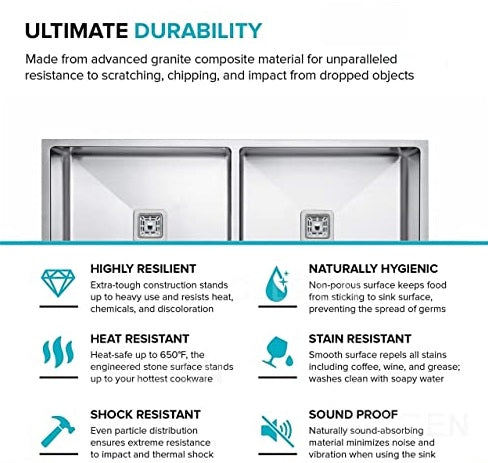 Noise Defend soundproofing technology absorbs vibration and minimizes noise when the sink is in use.