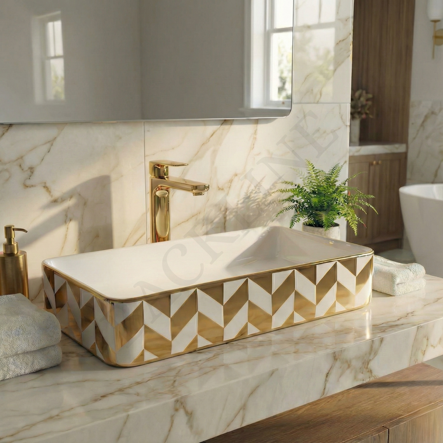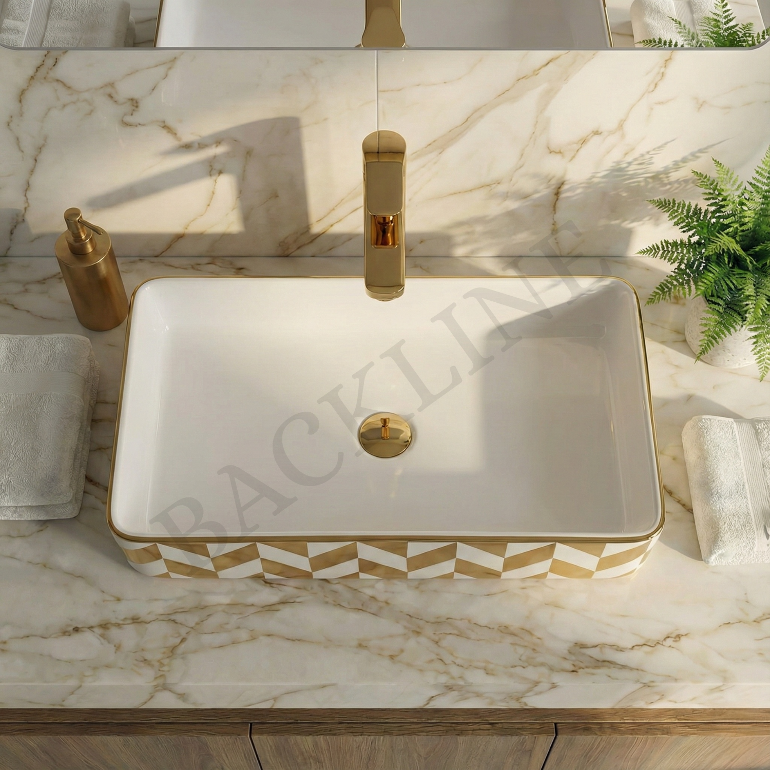 Ceramic Rectangle Shape Counter Top Wash Basin Gold Color